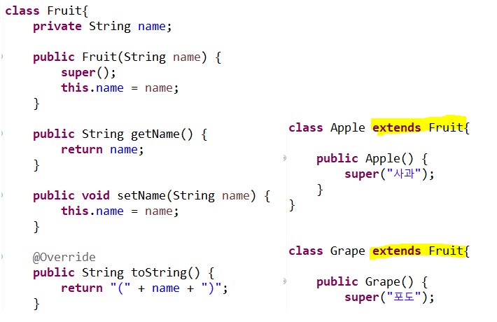 >> 부모 클래스 Fruit 와 상속받은 Grape / Apple 클래스
