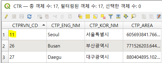 데이터를 살펴보면 CTR 레이어의 CTPRVN_CD가 SIG레이어의 SIG_CD 의 앞 두자리와 일치한다.