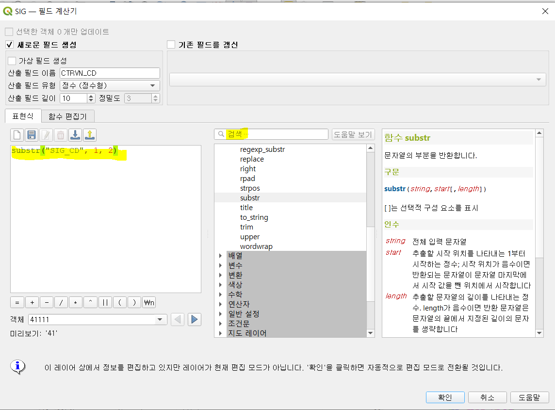SIG 레이어에 조인조건으로 사용할 필드 생성 했다.