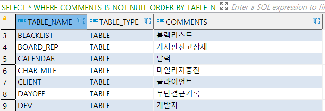 >> 모든 테이블, 뷰의 코멘트 목록이 출력되었다.