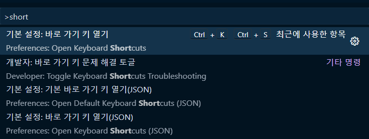 1) Ctrl + Shift + P 를 누르고 'shortcut' 을 검색해 단축키 설정 화면으로 들어간다.